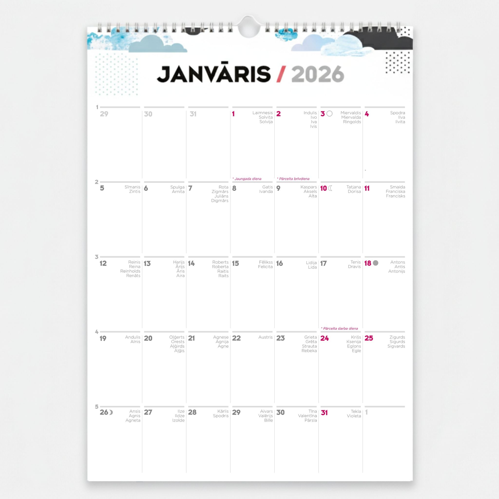 • Kalendārā iekļautas vārda dienas, nedēļu numuri, mēness fāzes un svarīgās svētku dienas